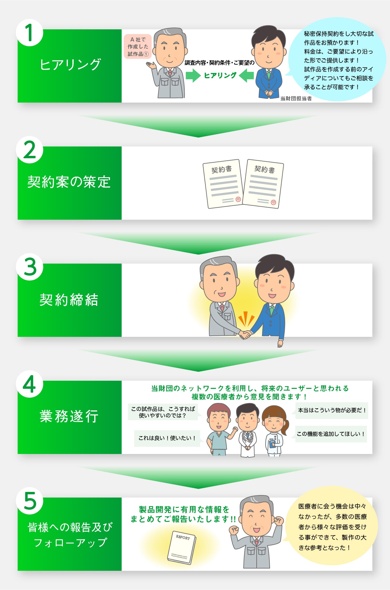 当財団は、貴社が保有する製品、開発・改良途上にあるシーズ及びアイディアと医療現場を繋ぐお手伝いを致します。